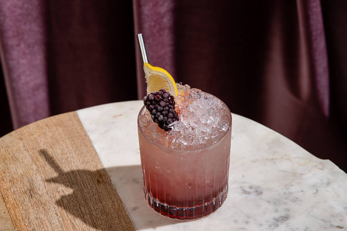 Add the American gin, lemon juice and sugar syrup into a cocktail shaker. Shake with cubed ice for 15 seconds and strain into a rocks glass. Fill the glass with crushed ice, float the Crème de Mure and garnish with blackberries and lemon. Serve drink with a straw.
