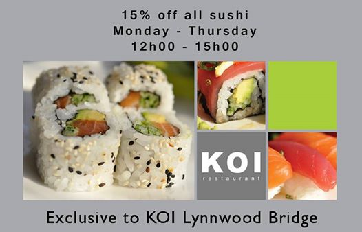 During lunch hours from 12h00 – 15h00, KOI Restaurant at Lynnwood Bridge is offering 15% off all sushi. This special is available during the week from Mondays – Thursdays. Booking is advisable as tables can fill quickly.