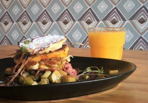 The Federal – Brunch – Dutched Flapjacks – Chunky apple flapjacks served with grilled haloumi, crispy wild boar bacon, leek hay and five-spiced butterscotch