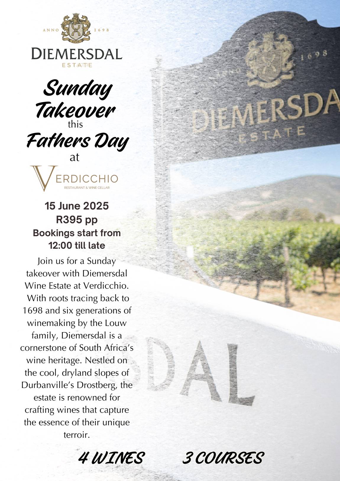 On Father’s Day – 15 June 2025, Verdicchio Restaurant and Wine Cellar is turning up the charm with a Sunday Takeover by Diemersdal Wine Estate – and trust us, it’s the kind of Sunday session dads dream about.