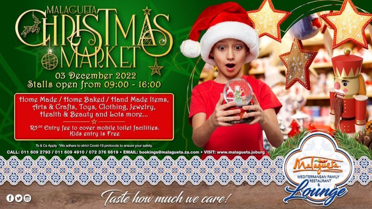 Malagueta is hosting one of the best Christmas markets in Joburg and you are invited to join them for a great time with the entire family; expect home-made, home-baked, hand-made items, arts and crafts, toys, clothing, jewellery and lots more so you can get all your Christma shopping done at one place without having to brave the shopping malls.