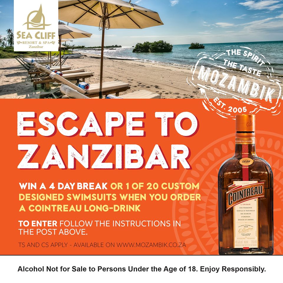 Order any Cointreau long drink or cocktail from Mozambik, take a picture and Whatsapp it to them at the number provided in store and stand a chance to win a four day break to Zanzibar or 1 of 20 custom designed swimsuits.