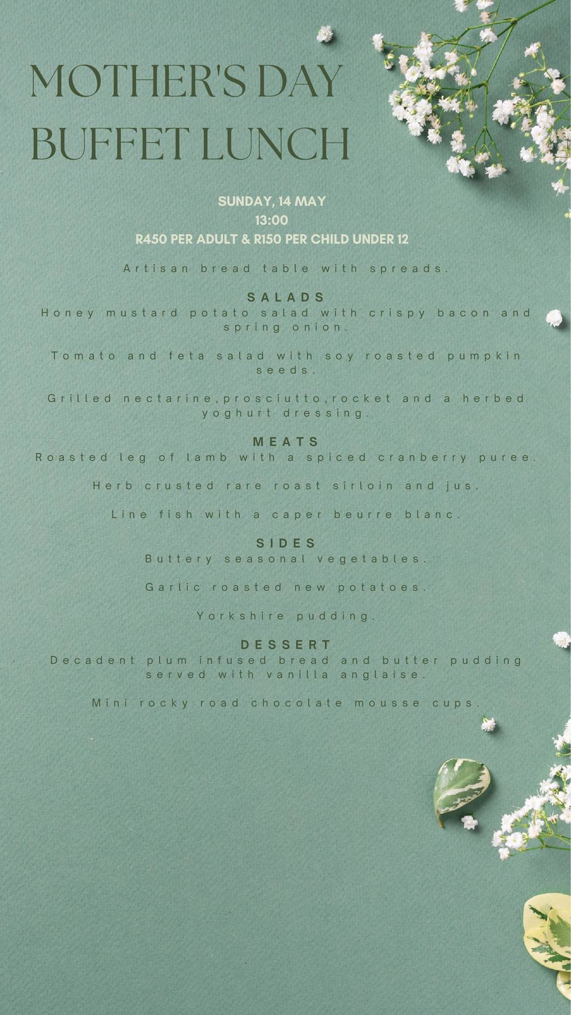 - For the main course, your mom can choose from a range of mouth-watering meats and fish. The roasted leg of lamb with a spiced cranberry puree is sure to impress, as is the herb-crusted rare roast sirloin and jus. The line fish with a caper beurre blanc is a delicious seafood option that is perfect for those who prefer lighter meals.