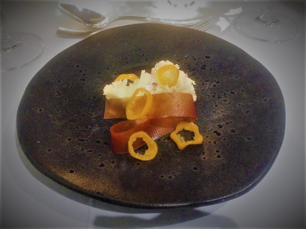 Before dessert, things took a different turn with a cheese course of Tete de Moine with kumquat preserve, guava leather and a goat’s cheese emulsion. This was delightful. The cheese was creamy but broke delicately beneath my fork with an almost crumbly consistency and was beautifully embraced by the sweetness of the guava. This was paired with Cederberg Bukettraube 2019, a surprisingly sweet white wine with apricot and floral notes on the nose. It pairs superbly with spicy dishes, like curries, and baked fruits.