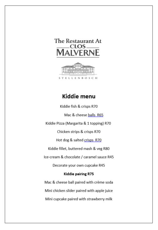- From classics like Fish & Crisps and Mac & Cheese Balls to more adventurous choices like Kiddie Pizza and Chicken Strips, there’s something to satisfy every young palate. Each dish is carefully crafted to appeal to kids while still maintaining the quality and taste that Clos Malverne is known for.