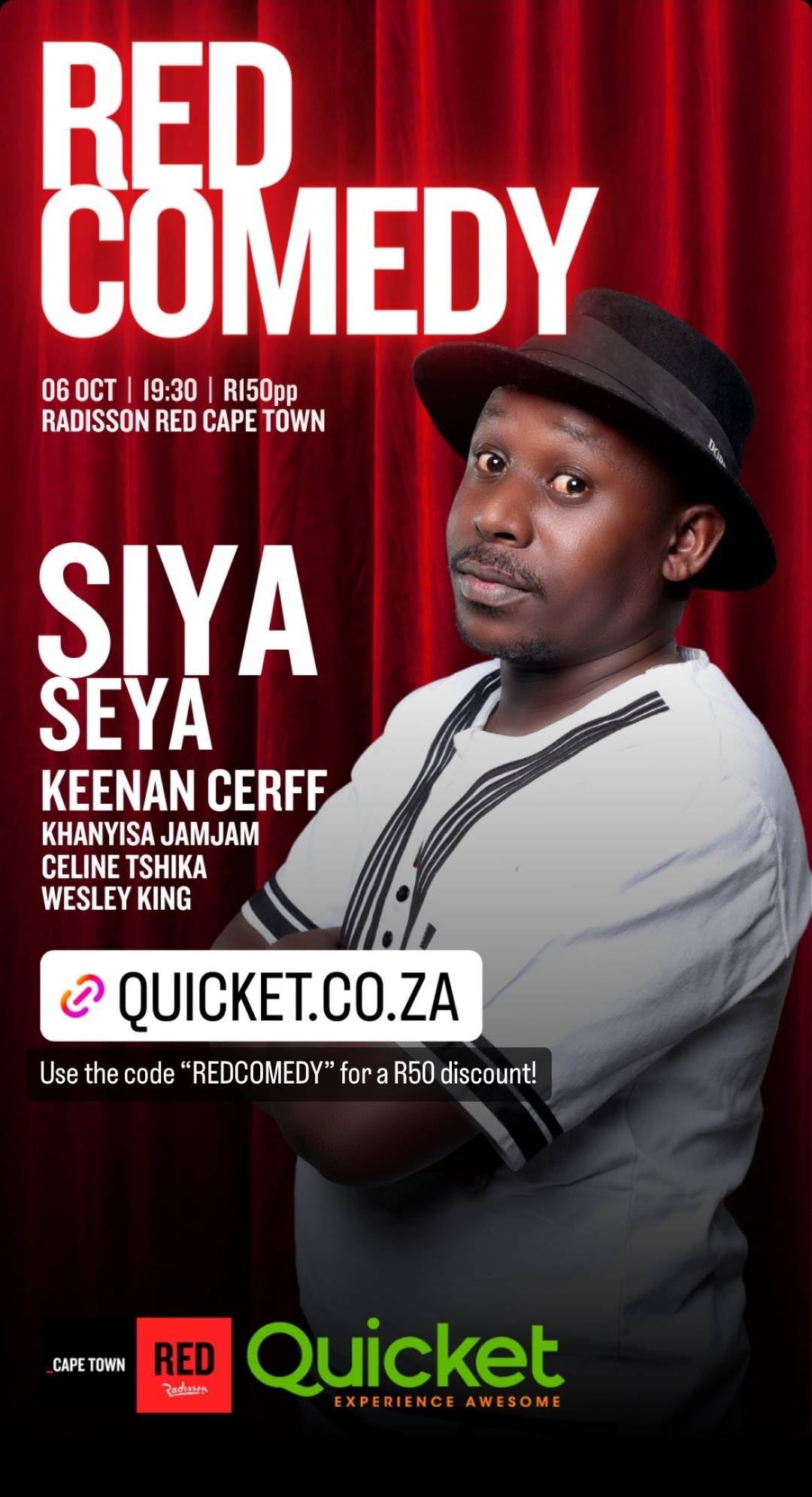 - Prepare to be entertained by the incomparable Siya Seya, a two-time Comics Choice Award winner, whose wit and humor have earned him a special place in the hearts of comedy aficionados. As your host for the evening, Keenan Cerff will keep the laughs rolling, ensuring you’re thoroughly entertained from start to finish.