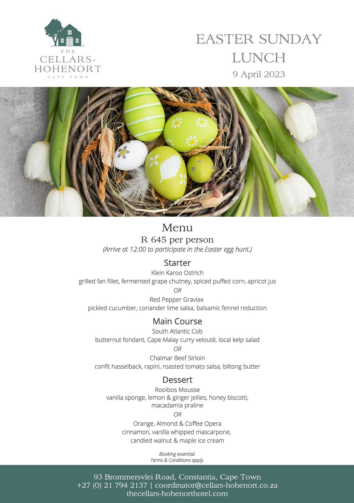 The Easter Sunday Lunch at Cellars Hohenort is priced at R 645 per person, and booking is essential. You can call the hotel at 021 794 2137 or email coordinator@cellars-hohenort.co.za to make a reservation. Please note that terms and conditions apply.