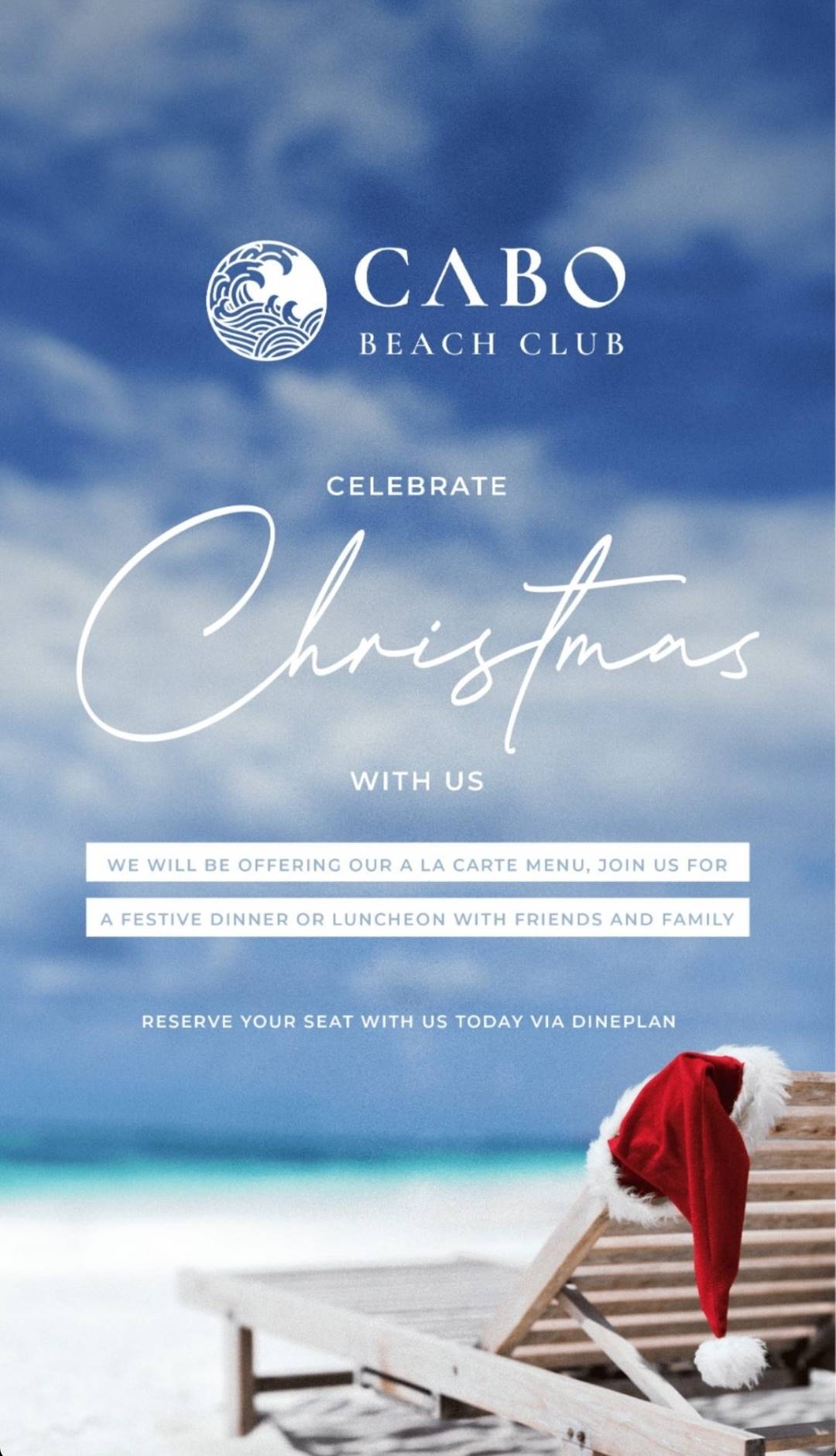 - Make this Christmas memorable by joining Cabo Beach Club in their festive celebrations. Reserve your seat now and treat yourself to a culinary journey that epitomizes the essence of the season. Experience Christmas the Cabo way – where exceptional cuisine meets the warmth of celebration.