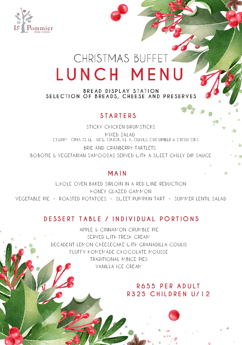 - The Christmas Buffet Lunch Menu at Le Pommier presents an array of culinary delights, expertly curated to tantalize the taste buds. Priced at R655 per adult and R325 for children under 12, this exceptional feast is a testament to the restaurant’s commitment to delivering excellence.