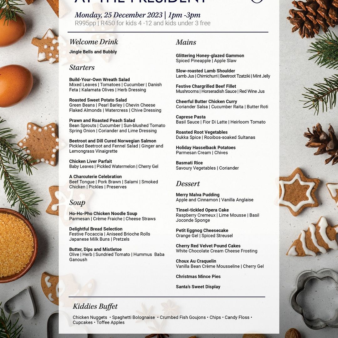 With live entertainment, a dedicated kids buffet, Santa’s Sweet Display, and a kids’ play area, this Christmas celebration offers a little something for everyone in the family. Book your table now through their website www.presidenthotel.co.za or email fbadmin@presidenthotel.co.za.
