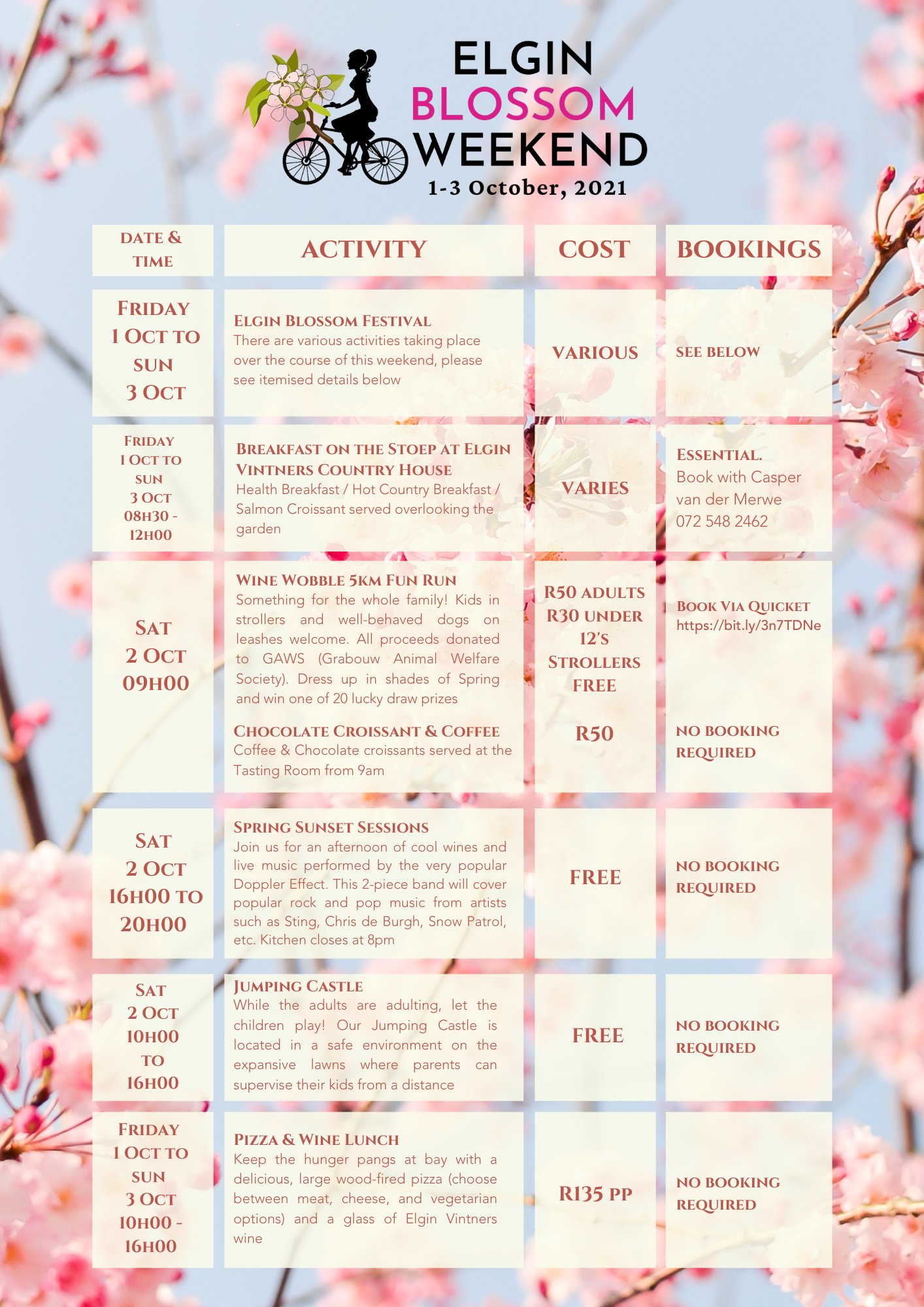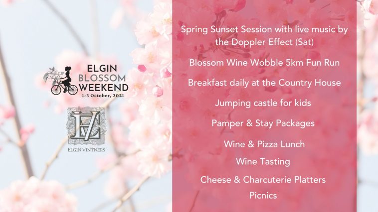 Visitors will be able to taste exceptional Elgin Vintners wines and enjoy lovely outdoor activities such as a 5km fun run amongst the flowering orchards and vineyards. The spectacular gardens and vast lawns at Elgin Vintners offer ample space for social distancing.