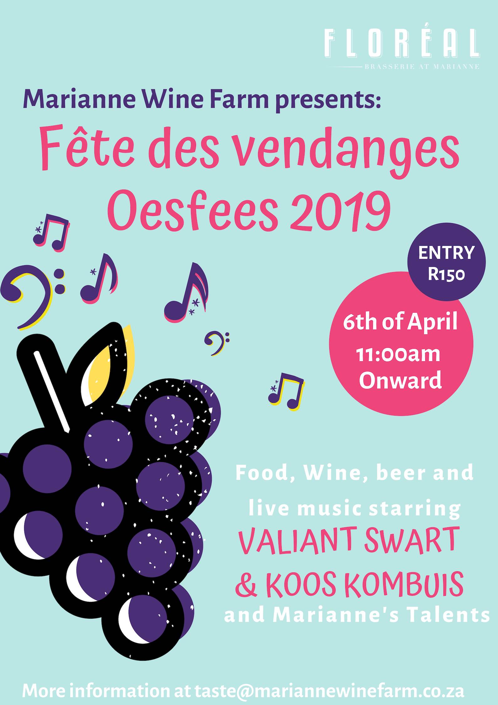 On the 6th of April 2019, join Marianne for their annual Harvest Festival featuring Valiant Swart & Koos Kombuis. Along with fantastic live music, you will also experience incredible food, wine, beer and much more.