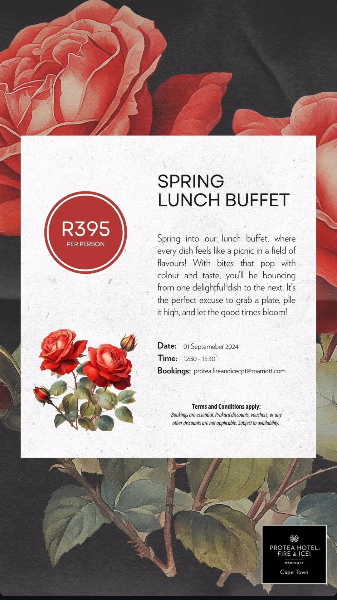 Priced at just R395 per person, this is the perfect excuse to gather friends and family for a joyous feast. The picturesque setting of Protea Hotel Fire & Ice! adds to the charm, making it an ideal spot to welcome the new season in style. Don’t miss out on this blooming celebration of flavors! Book your spot today by emailing protea.fireandicecpt@marriott.com and get ready to let the good times roll.