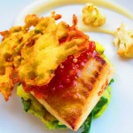 Pan-fried line fish Indian spiced potato, spinach, cauliflower, onion bhaji, tomato chutney