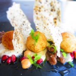 Mezze Crispy ricotta, hummous, smoked aubergine puree, yoghurt, pickled walnuts, pomegranate, mint oil