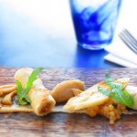 Chicken parfait spring roll, pear chutney, pickled mushrooms, mushroom caviar