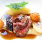 Beef onglet steak Onion marmalade, smoked onion puree, cheese croquette, mash
