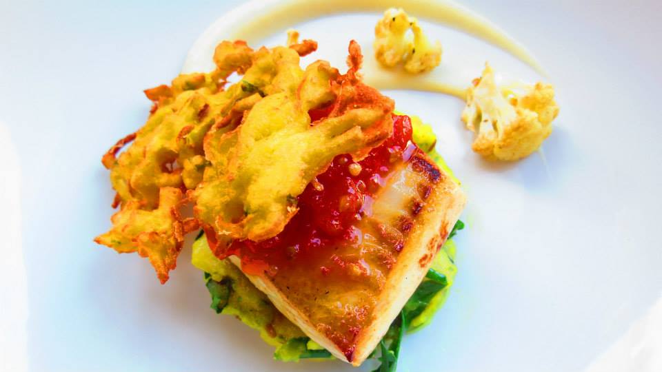 Pan-fried line fish Indian spiced potato, spinach, cauliflower, onion bhaji, tomato chutney