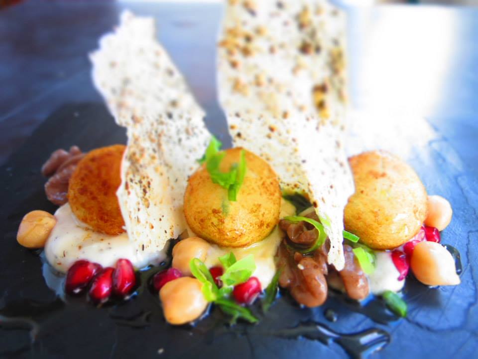 Mezze Crispy ricotta, hummous, smoked aubergine puree, yoghurt, pickled walnuts, pomegranate, mint oil