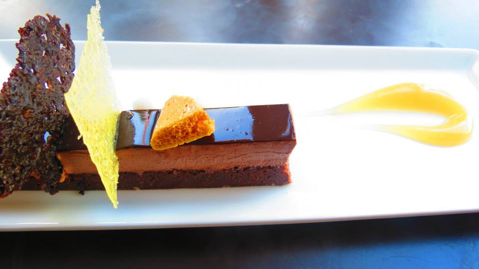 Dark chocolate pavé Honeycomb, chocolate brandy snap, orange puree