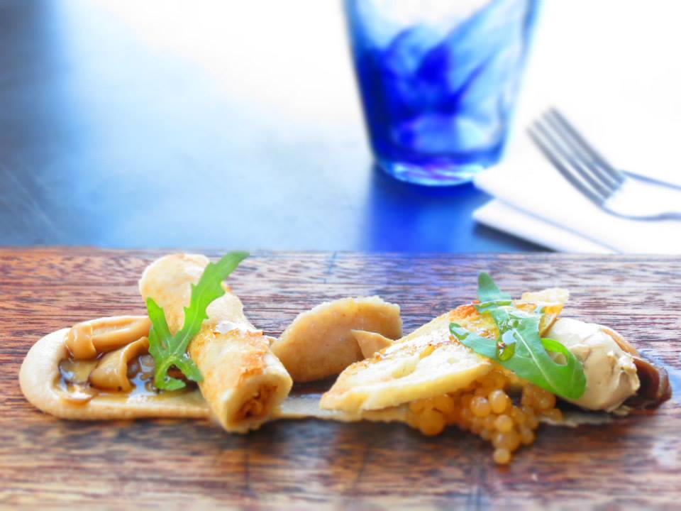 Chicken parfait spring roll, pear chutney, pickled mushrooms, mushroom caviar