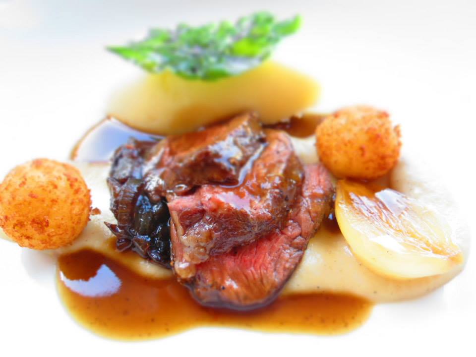 Beef onglet steak Onion marmalade, smoked onion puree, cheese croquette, mash