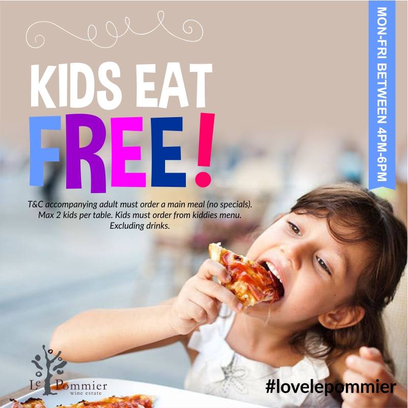 Monday to Friday: 4-6pm. Your child must be accompanied by an adult. Max two kids per table and excludes drinks. The adult or parent must also order a main meal and the kids have a choice from a delicious kids menu.