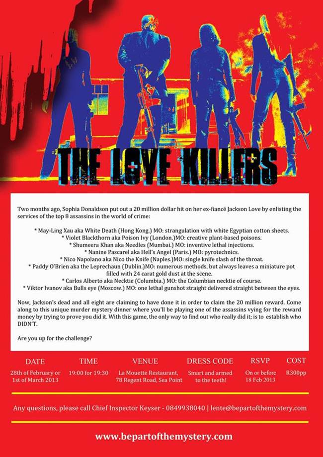 Nevertheless, I am all too excited for the upcoming murder mystery being hosted at La Mouette. For R300 you get a 3 course dinner and a murder with a twist: