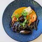 Cape Malay curry sauce| garlic prawns | mussels | line fish | cuttlefish ink linguine