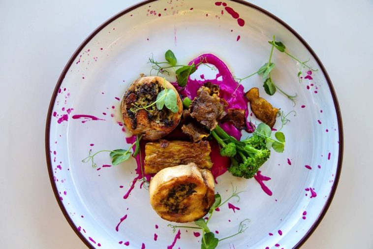 Leek | pancetta | ricotta | sweet potato boulangère | beetroot puree | red wine jus | herb oil | butternut and cinnamon chips