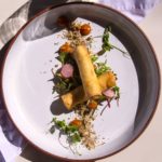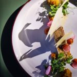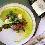 Salsa verde | coconut & onion foam | charred onion | potato pave | corral tuile | red wine honey pomegranate jus | wasabi infused pea puree