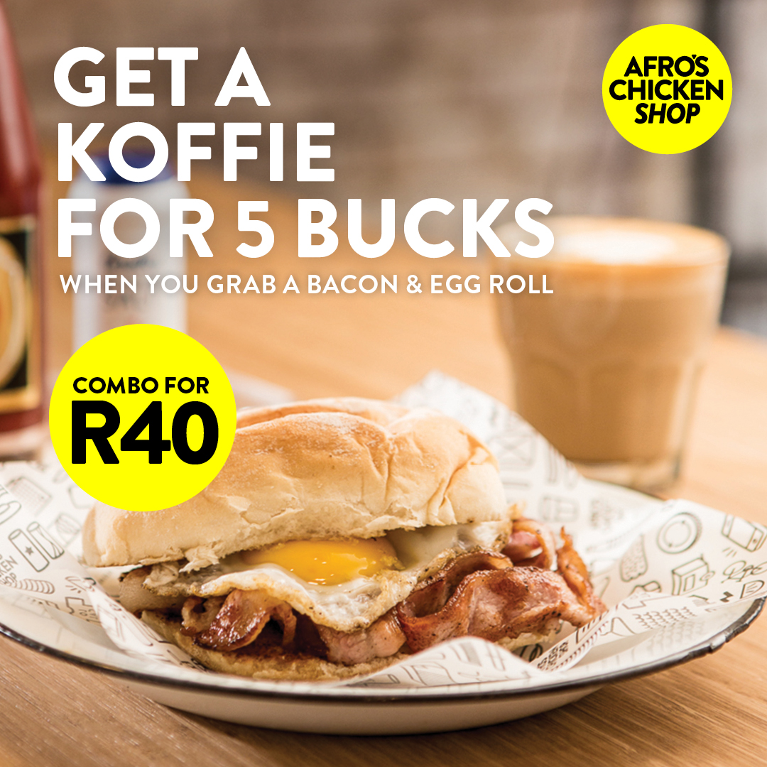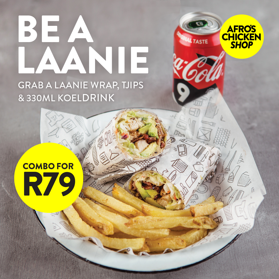Afros has introduced two stellar promos for the month of August you should definitely take advantage of. The Laanie Wrap Promo: get a Laanie Wrap (Chicken, Bacon & Avo) with a Side of tjips, coleslaw or 50/50 tjips & coleslaw & a 330ml Koeldrink for R79.