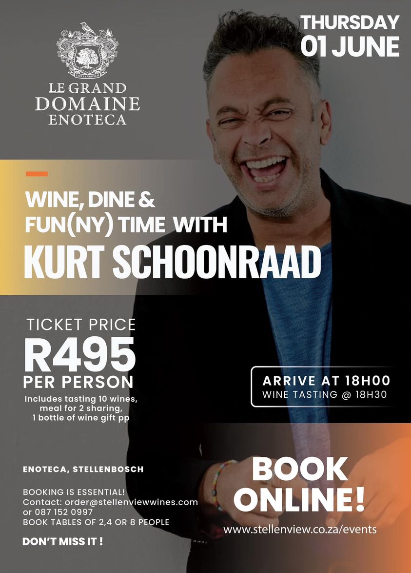 Prepare for an unforgettable evening filled with exquisite wines, delectable cuisine, and side-splitting entertainment by the only Kurt Schoonraad!