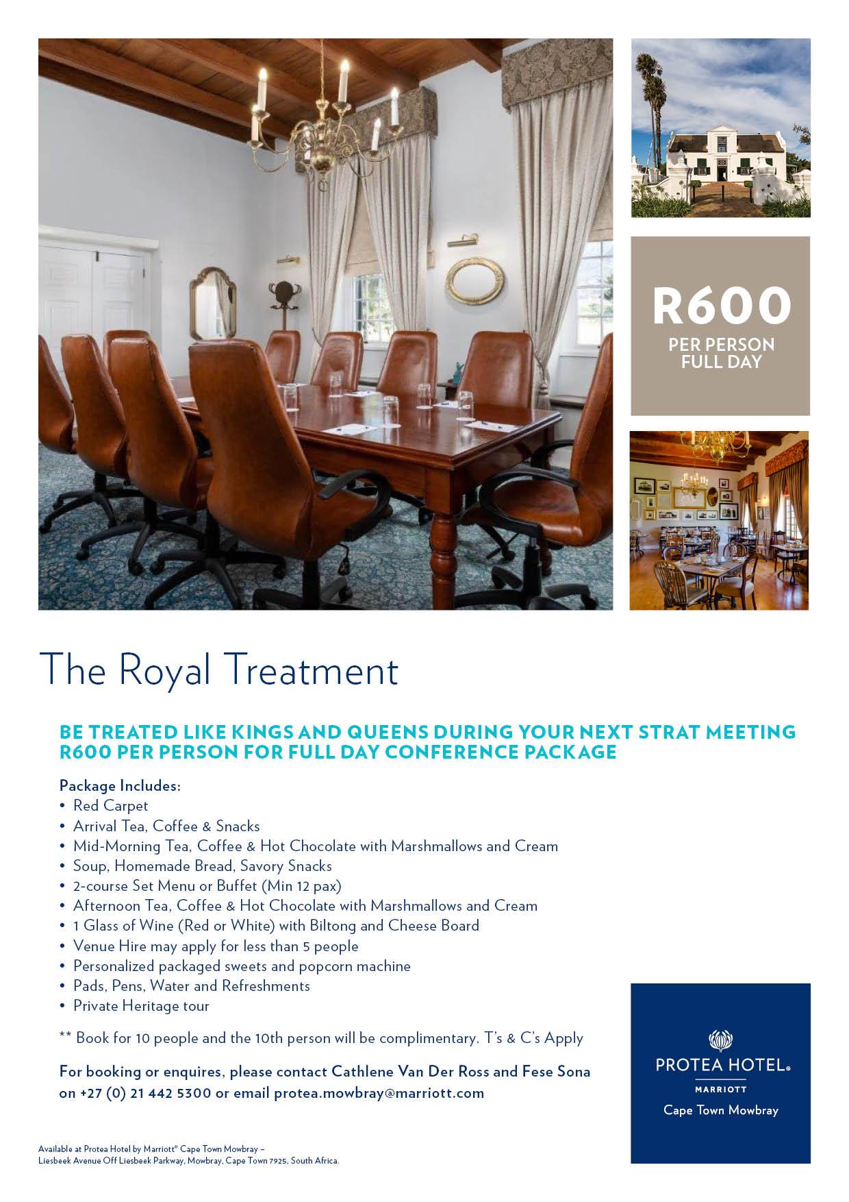 For bookings or further inquiries, reach out to Charlene Van Der Ross and Fese Sona at +27214425300 or via email at protea.mowbray@marriott.com.