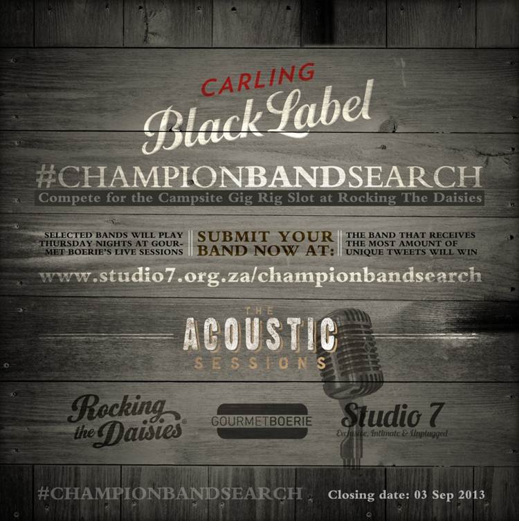 Local Cape Town bands have the chance to play at one of South Africa’s premier music and lifestyle festivals – Rocking the Daisies – thanks to the collaboration of Carling Black Label, Gourmet Boerie, Studio 7 and Rocking the Daisies. Starting from Friday, 23 August, bands will be given the opportunity to enter Gourmet Boerie’s acoustic sessions, which in return will act as the competition platform for the Campsite Gig Rig Slot at the 2013 Rocking the Daisies Festival.