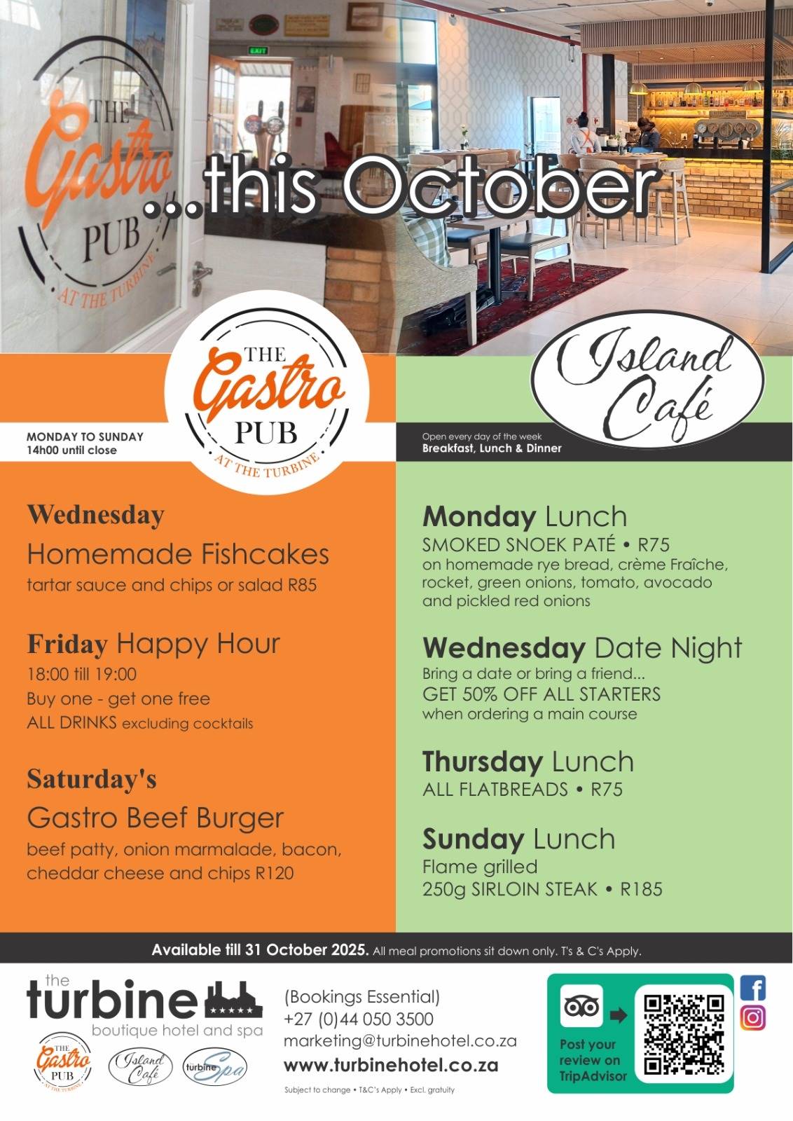 Whether you’re road-tripping, staycationing, or just hungry after a Knysna forest hike, The Turbine Hotel’s food scene has something worth stopping for. And with these October specials, you don’t need a reason—just an appetite.