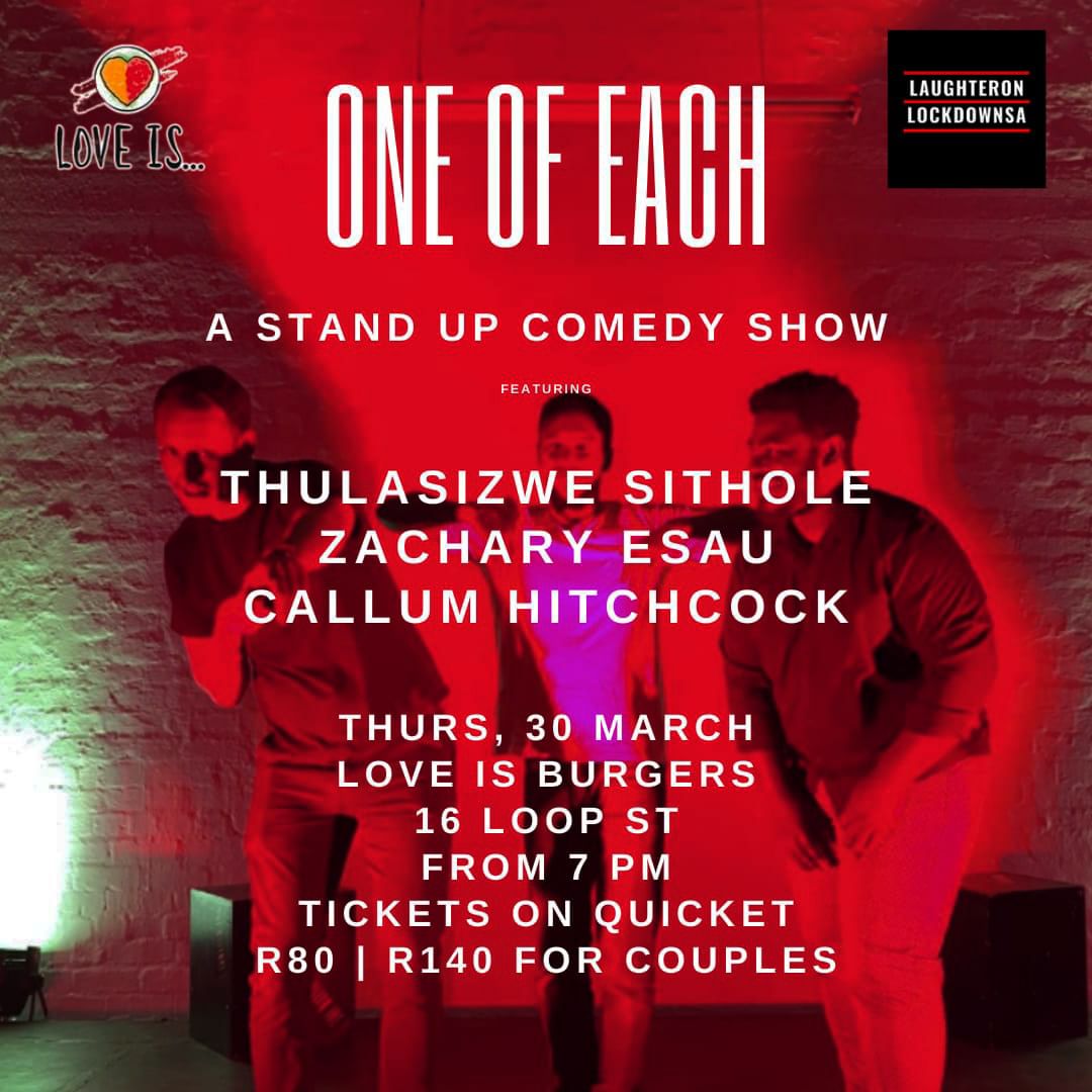 Then don’t miss Love Is Burgers’ upcoming event “One Of Each” – a stand-up comedy show featuring three talented comedians, Thulasizwe Sithole, Zachary Esau, and Callum Hitchcok.