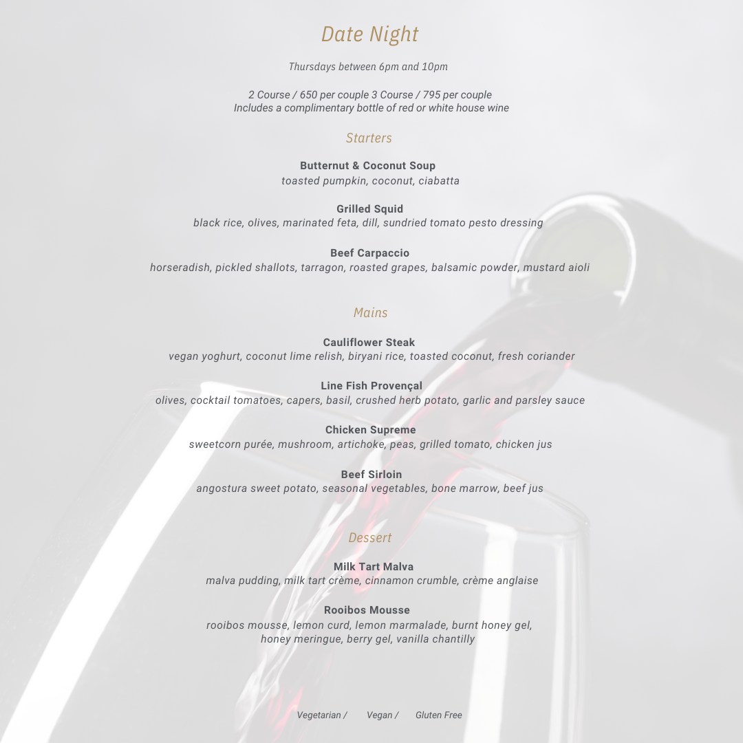 You and your favourite person can indulge in either a 2-course (R650) or 3-course (R795) dinner — per couple, not per person. And yes, that includes a complimentary bottle of red or white wine to toast your shared good taste.