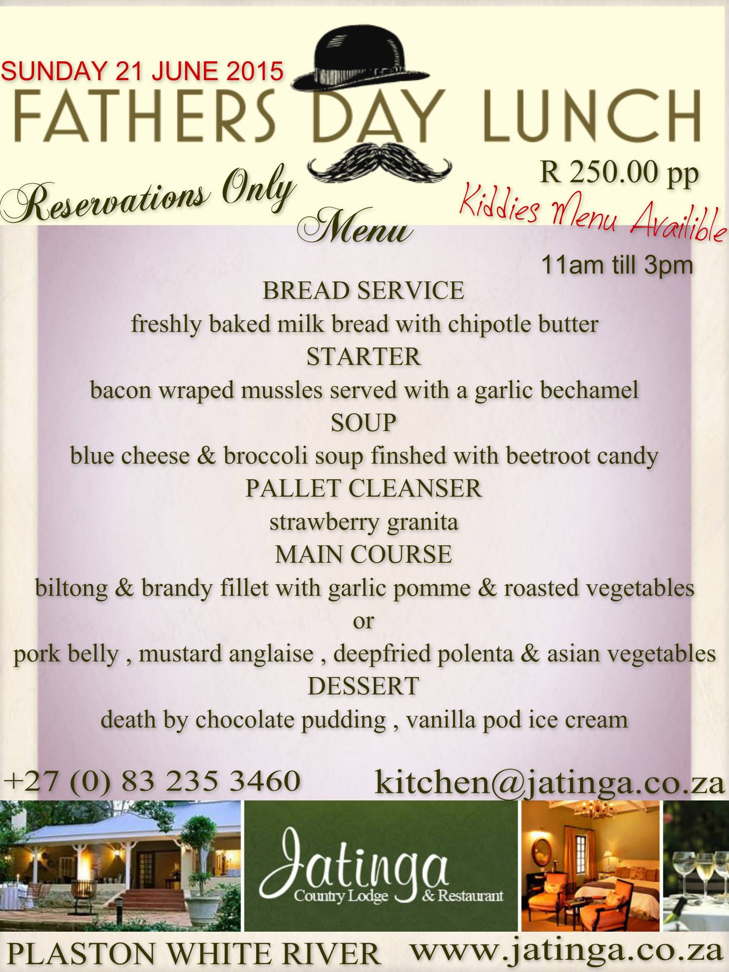 Jatinga is spoiling dads with a three course meal for R250 per person. They even have the kids sorted for the day! Here is what they have on offer: