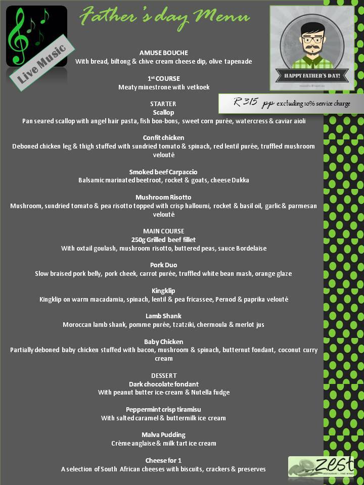 Zest is offering a great option for a fun day out with your dad. Here is what they have on offer. Call them to make a booking, space is limited: 013 007 0066.