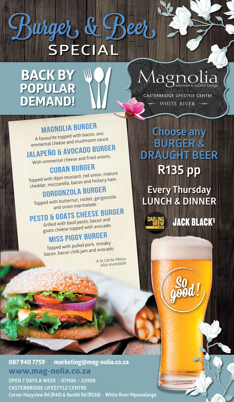 If you don’t have plans yet for Thursday, well now you have! You have to make your way to Magnolia Restaurant at Casterbridge Lifestyle Centre to try their burger and craft beer special.