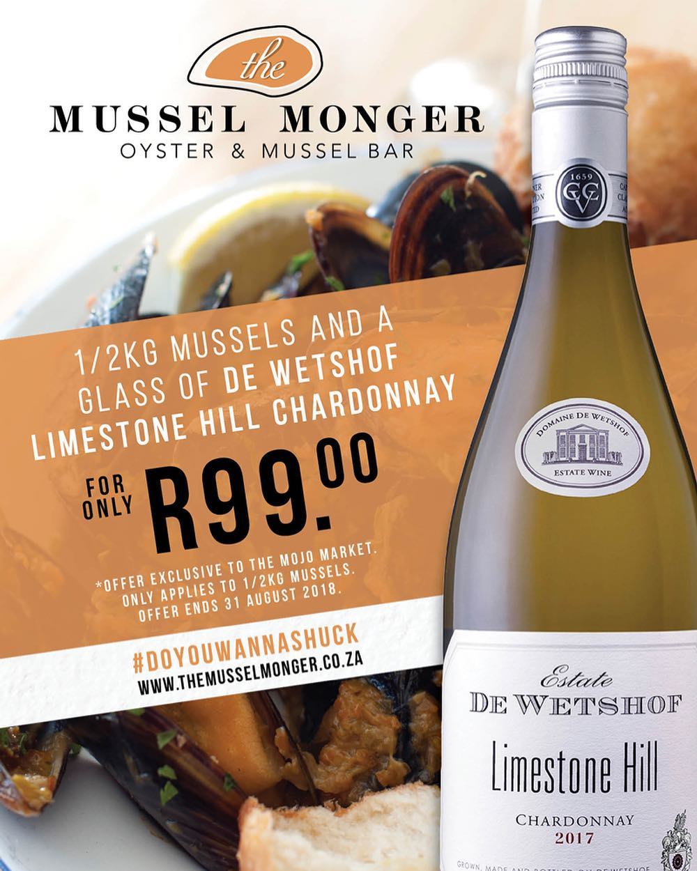 Enjoy a 1/2 kg serving of mussels and a glass of De Wetshof, Limestone hill Chardonnay for only R99 at the Mojo Branch of the Mussel Monger & Oyster Bar. A dish of delicious seafood and wine, all for under a 100 bucks…