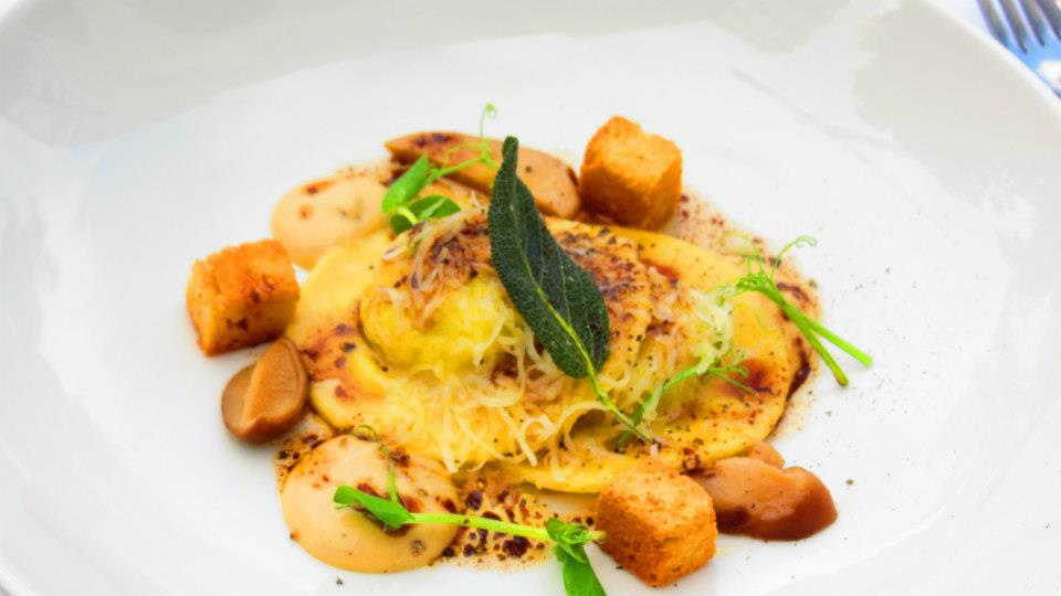 Smoked onion puree, croutons, pickled mushrooms, sage brown butter