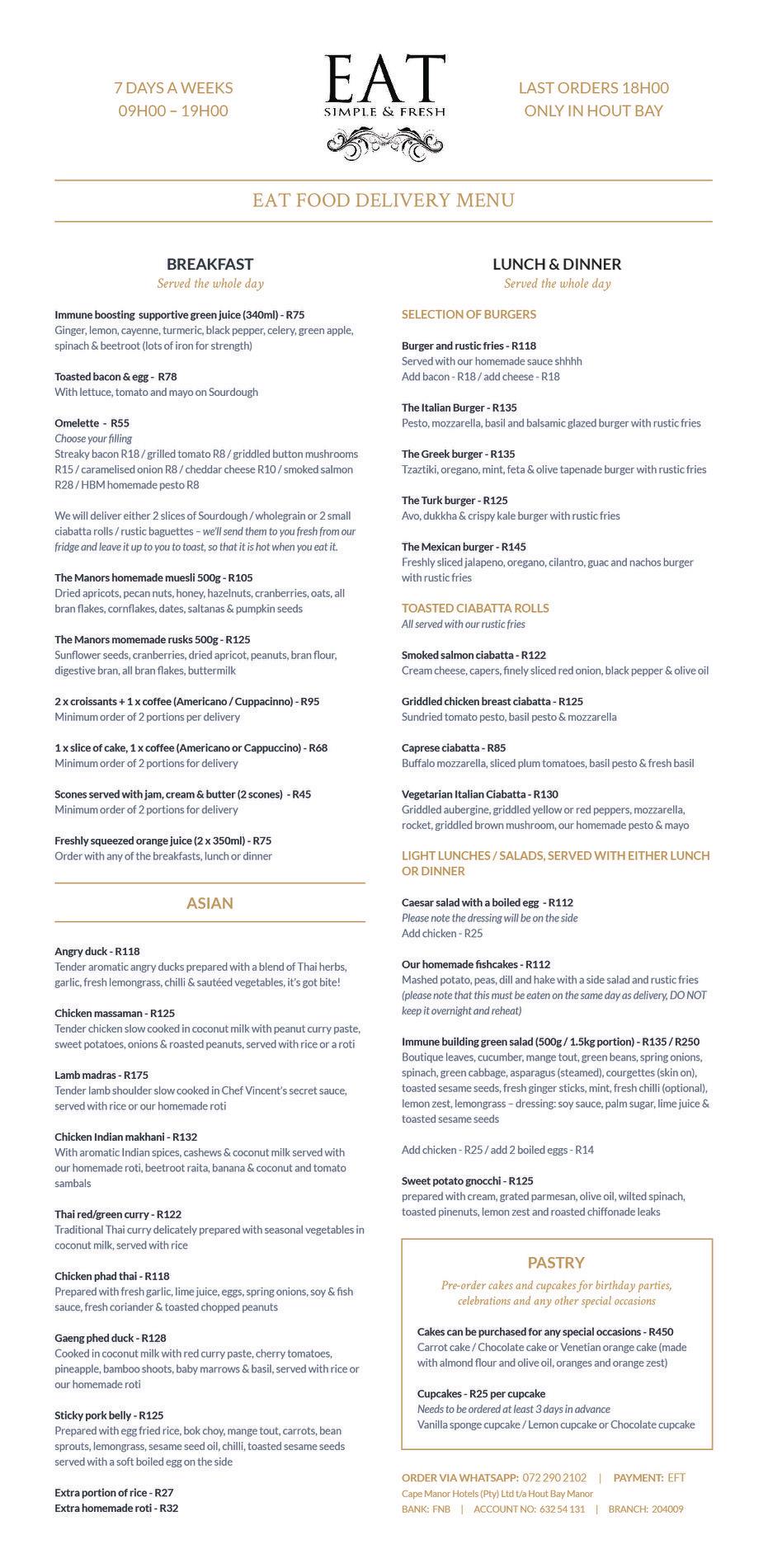 Order with Hout Bay Manor via whatsapp / sms on 072 290 2102.