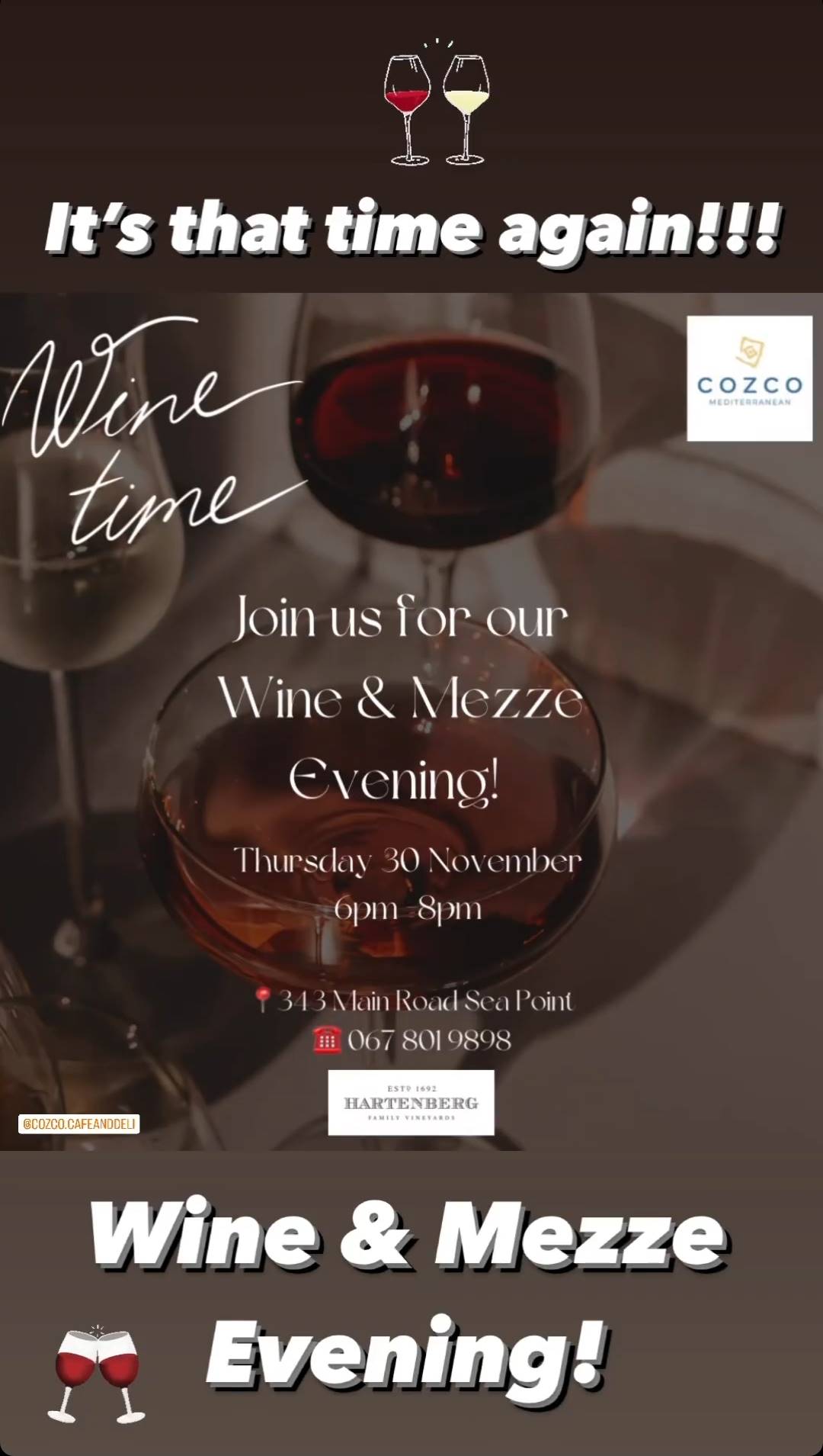 Nestled in the heart of Sea Point, Cozco Cafe & Deli invites enthusiasts to an exquisite evening of wine & mezze on Thursday, 30 November, from 6 to 8 pm.
