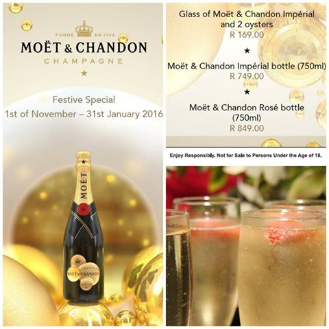 During the festive period (01 November – 31st January), you will receive a glass of Moet & Chandon and 2 oysters for R169. You can also buy champagne per bottle with Imperial (750ml) available for R749 and Rose (750ml) for R849.