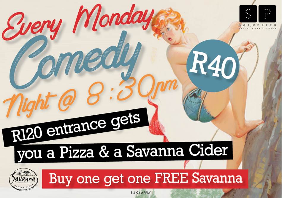 Every Monday night, SGT Pepper will be hosting comedy nights from 20h30 with tickets only costing R40 per person. On the day, they are also hosting a fantastic special where you receive any pizza & a Savanna Cider for only R120. In addition, a buy one get one free Savanna promotion will also be running.