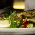 Crunchy shredded vegetables, basil, mint, chilli and seared salmon salad