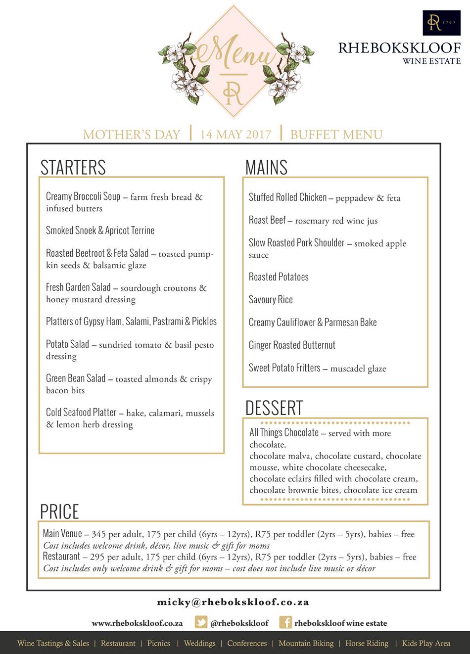 Rhebokskloof Wine Estate will be offering a mouth-watering Mother’s Day lunchbuffet with three different stations available to all guests. Spoil your mom this year and reserve your table at Rheboksloof. Tickets are R345 per person, while special rates for children apply.