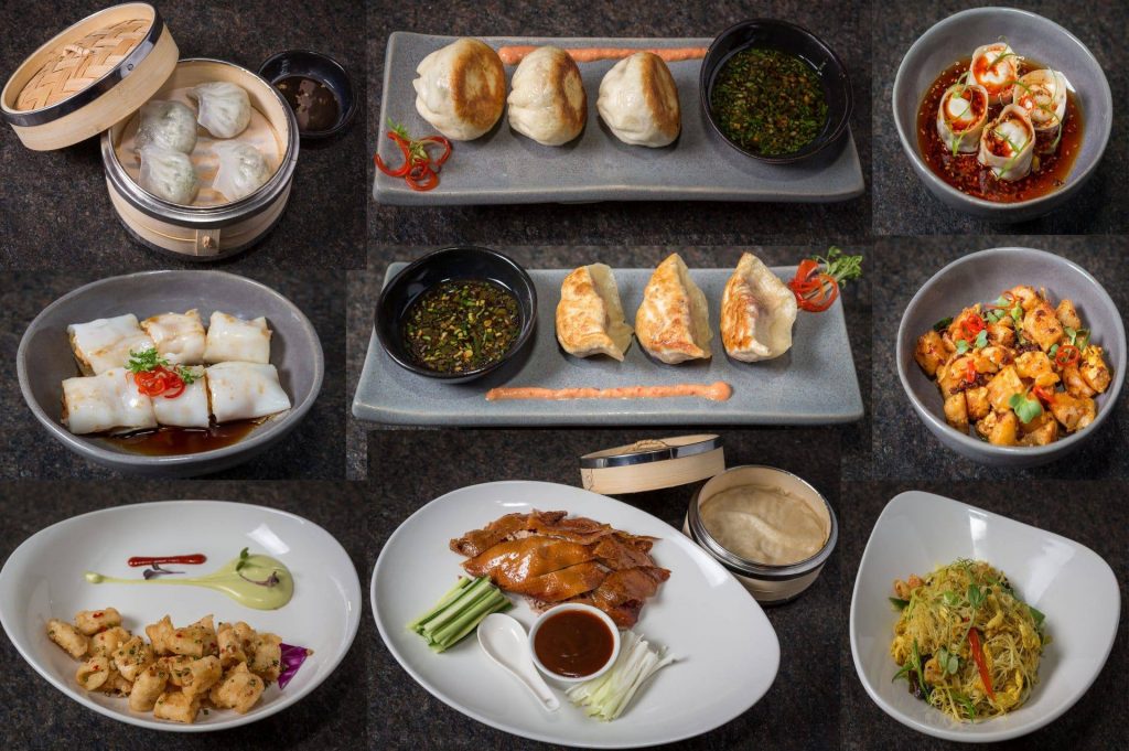The set menu includes Spinach Har Gau, Lamb Shui Jiao, Chicken Sheng Jian Bao, Mushroom Potstickers, Crispy Prawn Cheung Fan, Prawn XO Loh Bak Gao, Salt Pepper Calamari, Peking Duck and Seafood Singapore Noodles.